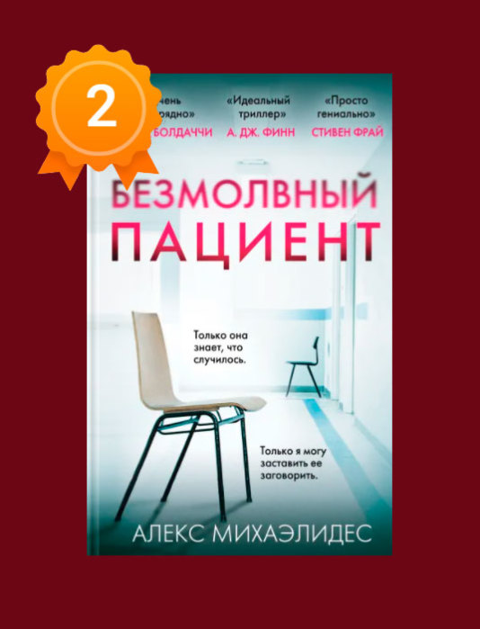 | | Безмолвный пациент | | Алекс Михаэлидес | | | Известная художница вышла замуж за востребованного модного фотографа. Однажды поздним вечером, когда ее муж Габриэль возвращается домой с очередной съемки, Алисия пять раз стреляет ему в лицо. | | |